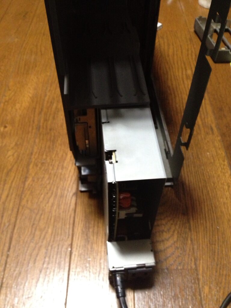 筐体内部に見える爪2カ所に注意しながら後部パネル部分を押し下げ外します。